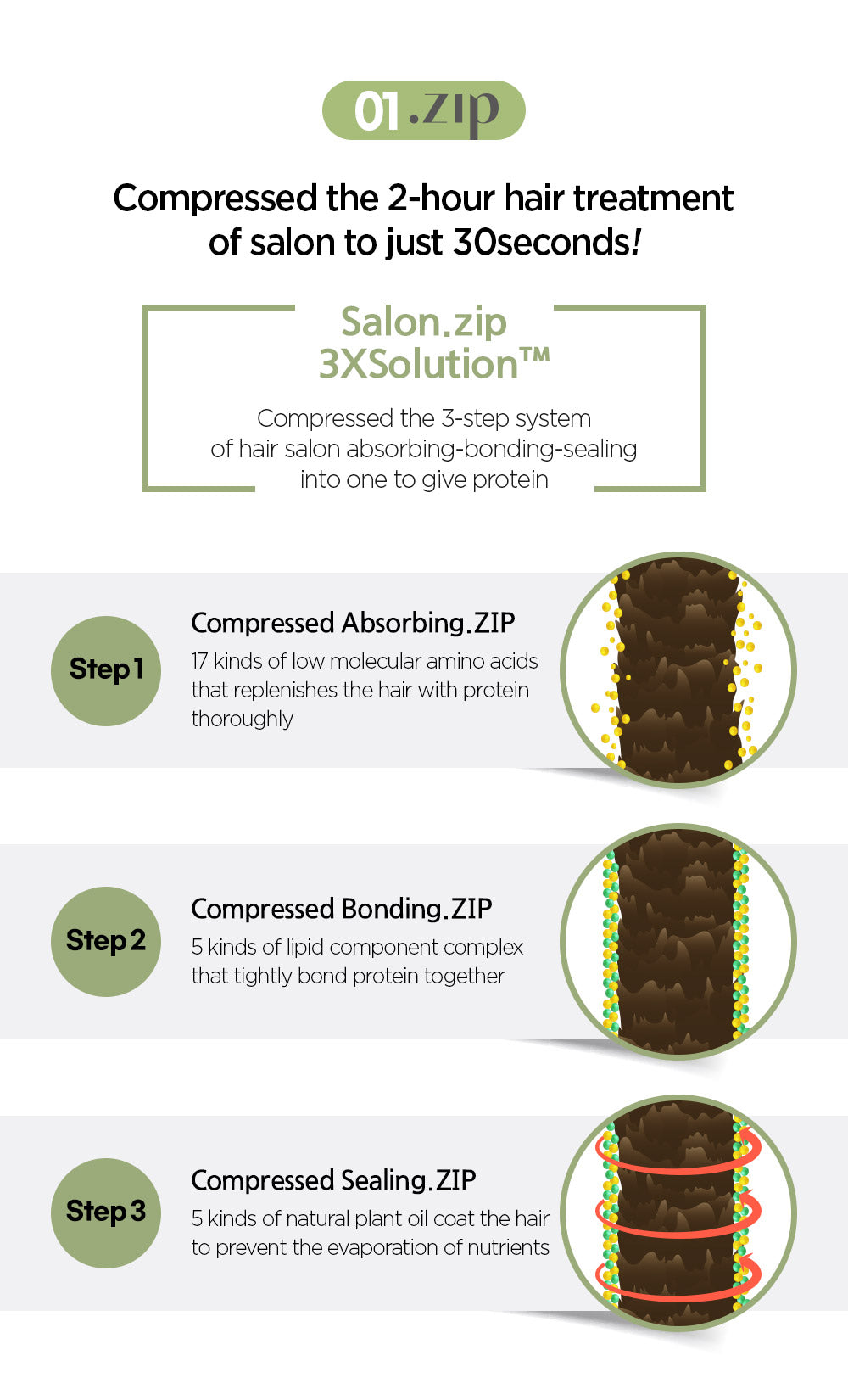 - Compressed Absorbing.ZIP: Infused with 17 types of low molecular amino acids, this step ensures deep protein replenishment for your hair.