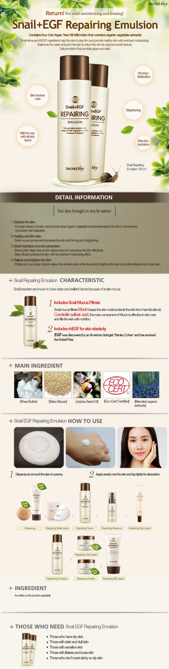 Snail mucus extract helps to renew and firm the skin, to provide brighter skin.