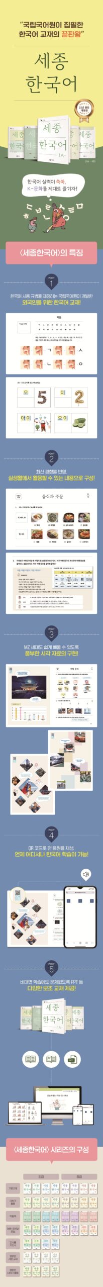 Sejong Korean stands as a nationally representative textbook, meticulously incorporating the ‘Standard Korean Curriculum’ and linguistic norms established in 2020. It considers multicultural diversity and gender sensitivity, offering enriched vocabulary and grammar explanations alongside real-life communication examples. The reinforced practice activities ensure a thorough understanding of the content.