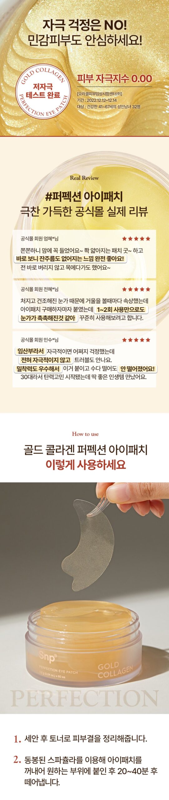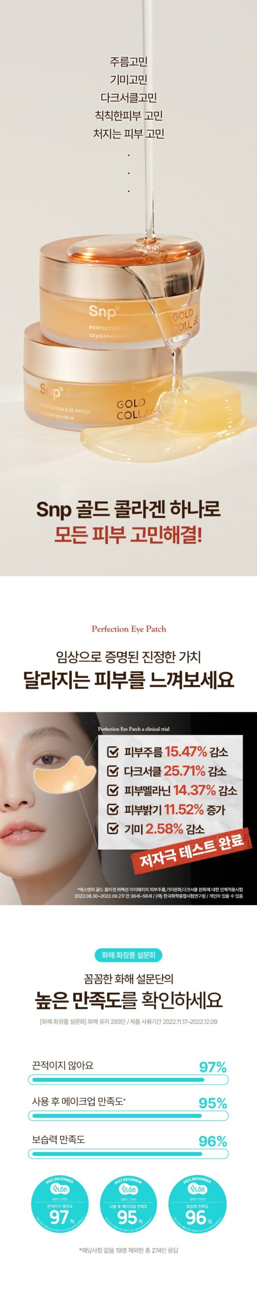 最近、SNP Gold Collagen Perfection Eye Patchを試してみました。正直なところ、これほどの効果を期待していませんでした。しかし、使用後すぐに目元がぱっと明るくなり、暗いクマも軽減されて驚いています。特に乾燥した冬の季節には、その保湿力とふっくら感が嬉しいです。また、不規則な生活からくる小じわも少しずつ改善されてきたようで、自分自身に自信が持てるようになりました。このアイパッチは朝のお手入れにも最適で、一日の始まりがさらに気分良くなるアイテムです。