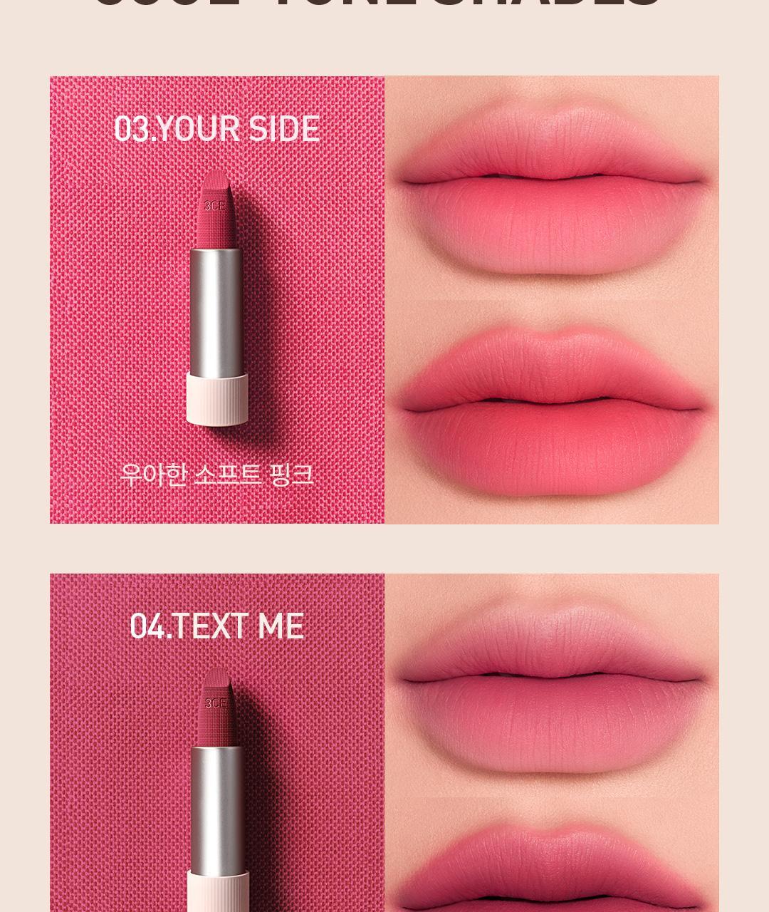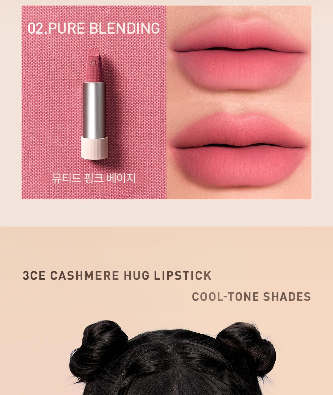 Indulge your lips with the softness of cashmere—experience the 3CE Cashmere Hug Lipstick today!